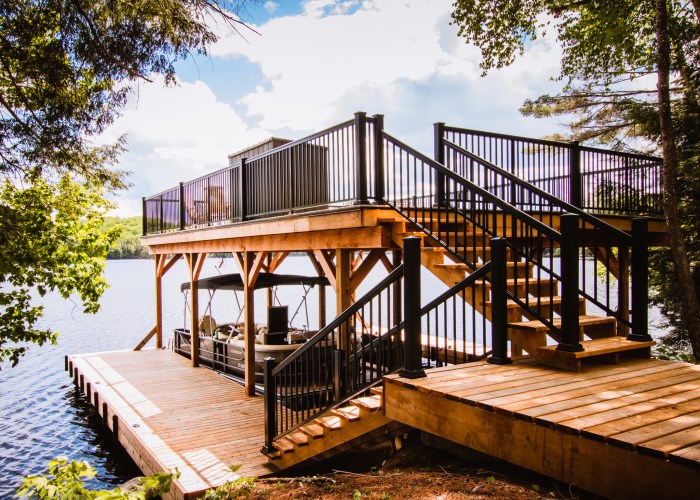 Cottage Country Deck and Rail specializes in Tufdek waterproof decking membrane and high quality aluminum and glass railings. Whether it’s an old deck that needs to be replaced or a brand new boathouse that needs fascia mount frameless glass railing, we offer products to suit all our clients needs.