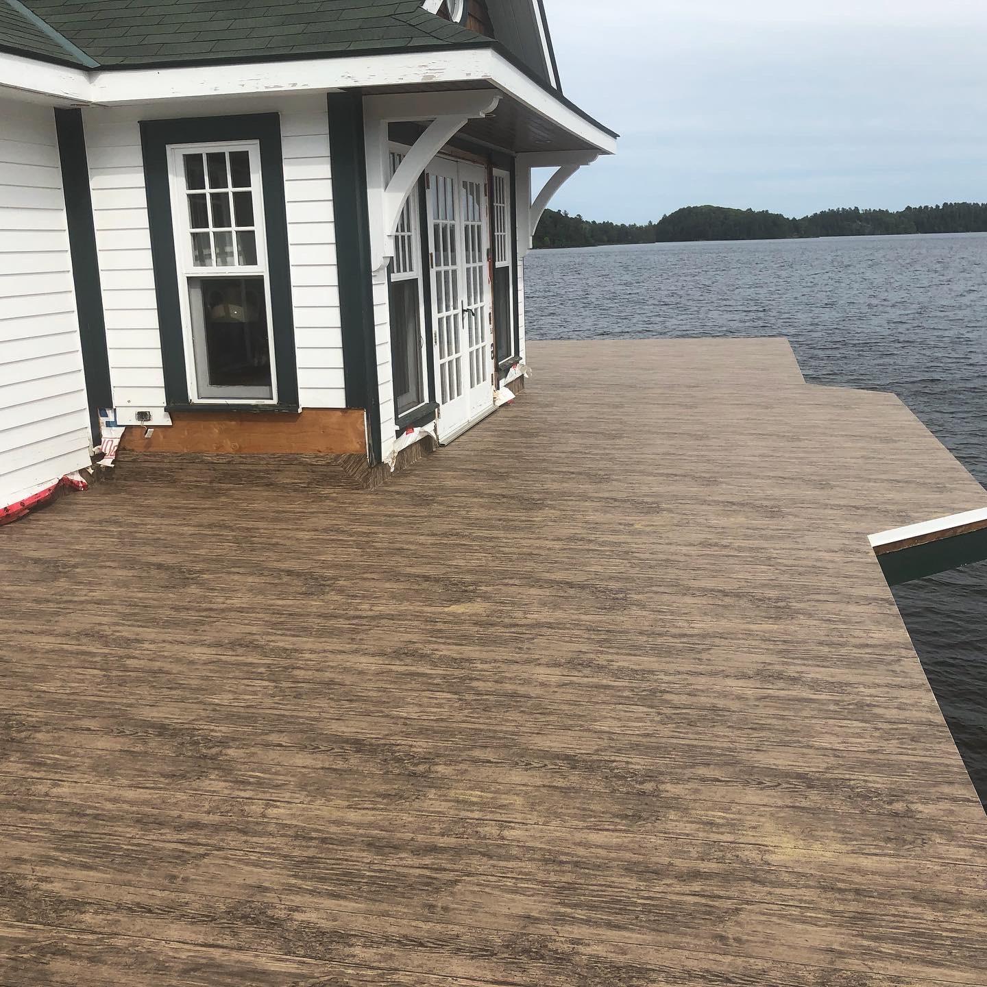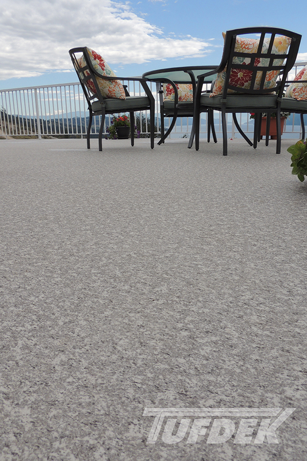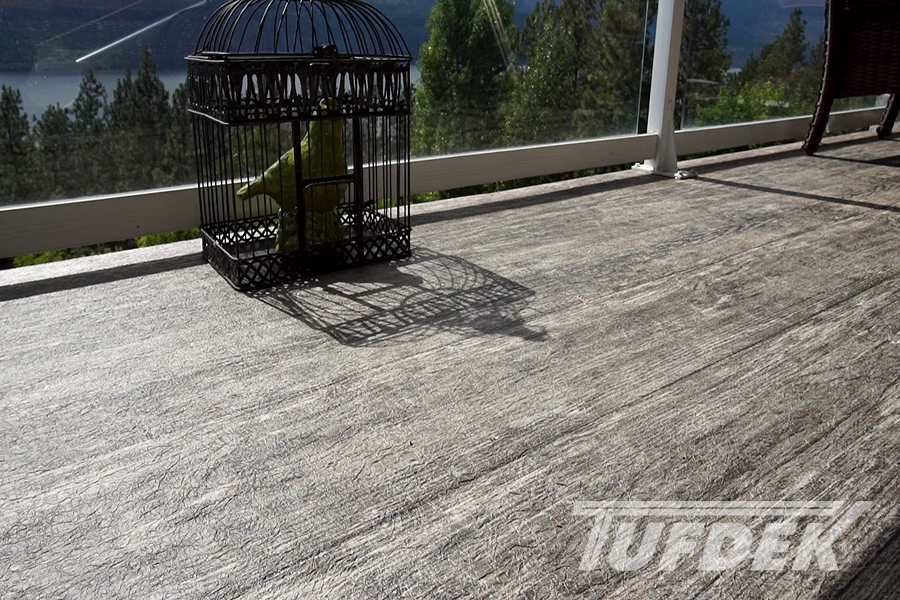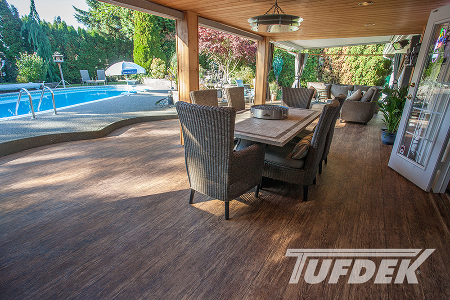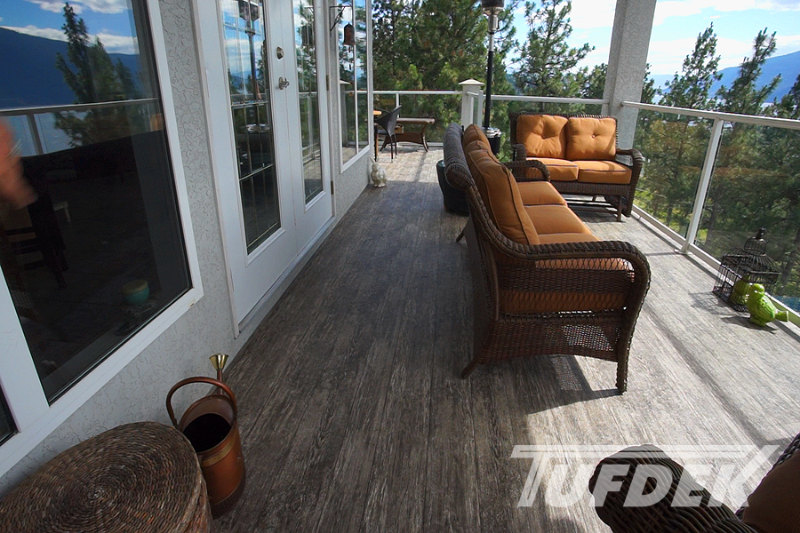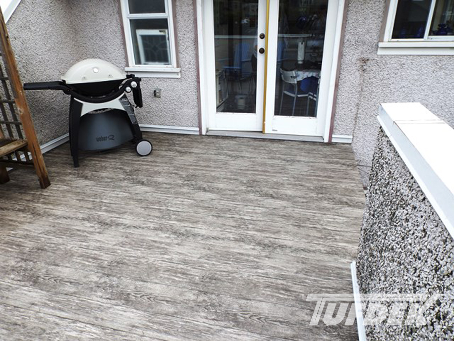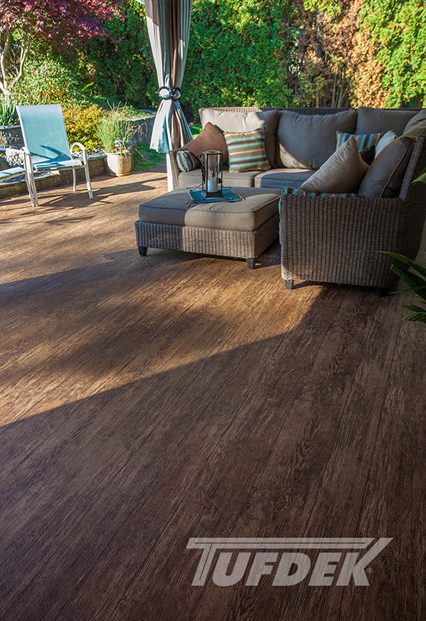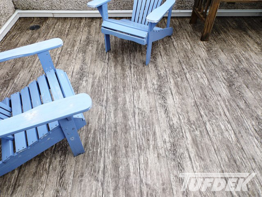 We are the licensed dealer for Tufdek in the Muskoka area. Tufdek is the strongest vinyl decking membrane in the world! The thin membrane is laid overtop of an already plywooded deck, glued down then welded at the seams. This creates an impenetrable waterproof barrier that stands the test of time. With an industry leading 20 year warranty, Tufdek is the best choice for those looking for low maintenance, long lasting waterproof decking. It comes in a very wide variety of colours, with patented printing technology that gives the vinyl a realistic look. Our most popular patterns are the plank style patterns that are made to look like real wood. With realistic knots and tree rings, you could almost be fooled that you’re not looking at real wood!